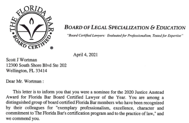 Congratulations to Scott J. Wortman, Esq., for his recent nomination for 2020 Justic Anstead Award for Florida Bar Board Certified Lawyer of the Year.